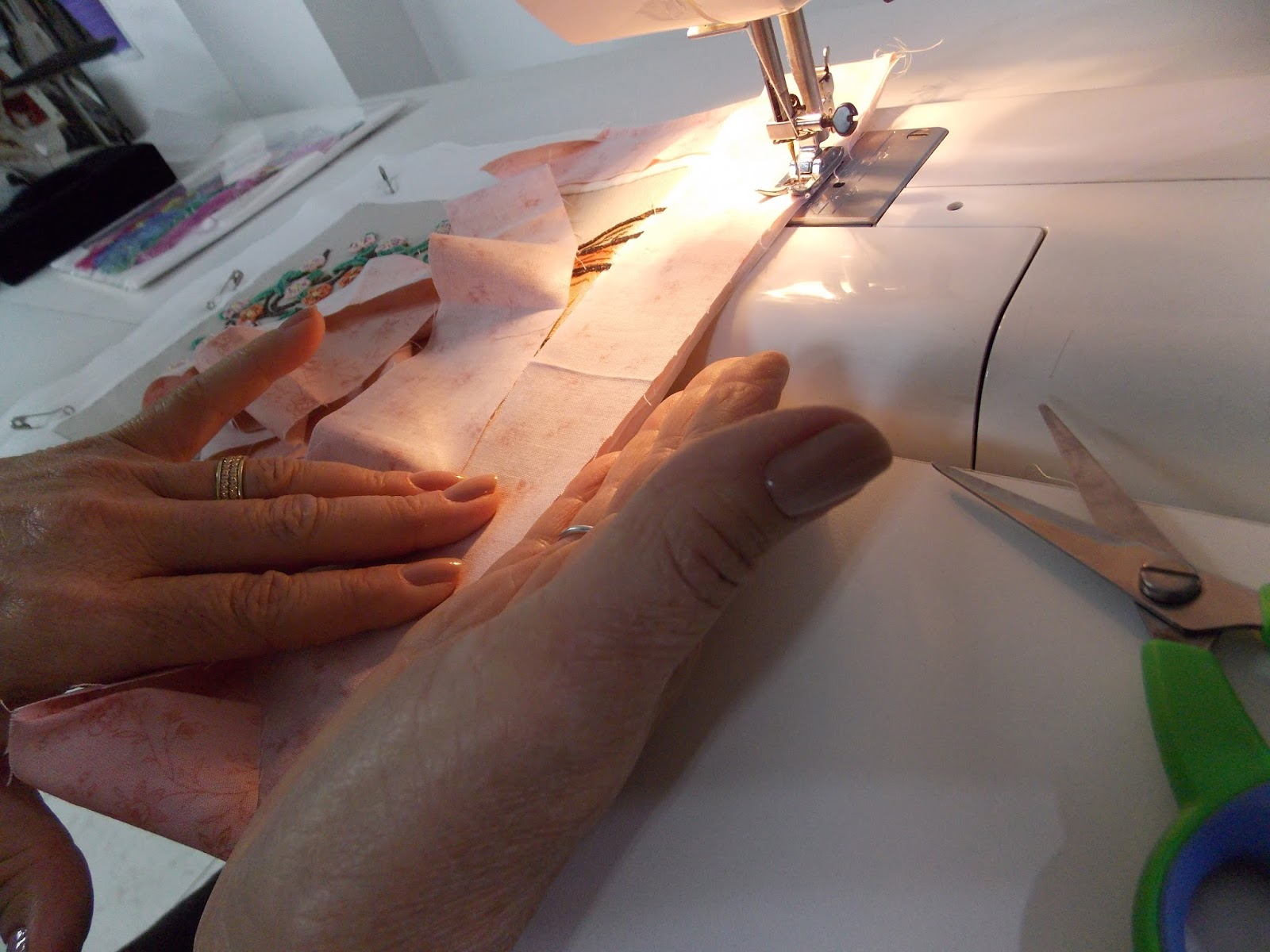 Desta forma bem emparelhada vamos iniciar a costura. Seguindo bem alinhada, tira e trabalho,